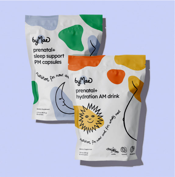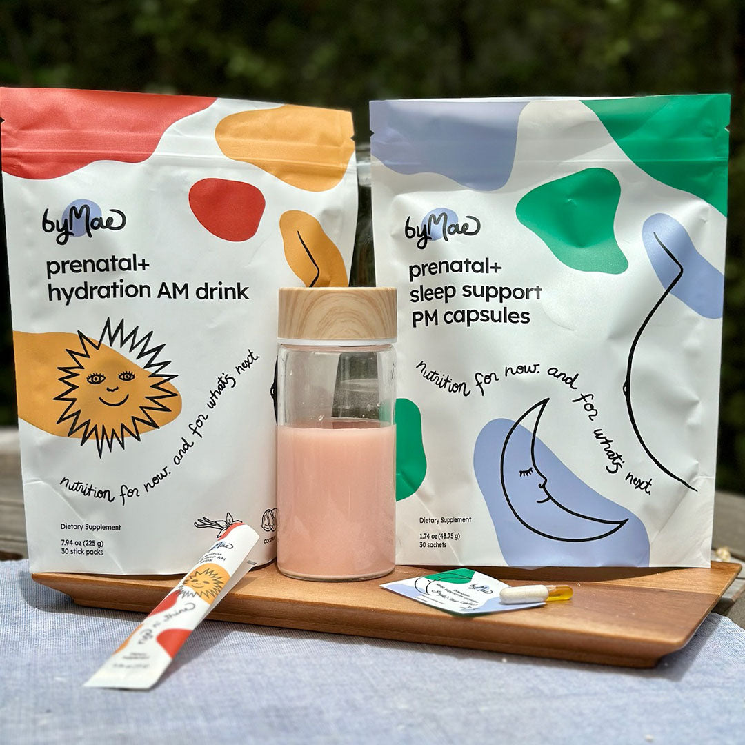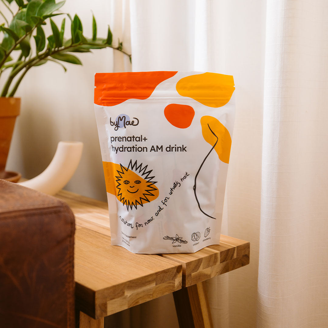 At byMae we’ve changed this. Our prenatal+ hydration meets all of the standards set by ACOG at exactly the right level (not too high, not too low), is divided into AM + PM formulas for optimized absorption, and includes hydrating coconut crystals for that extra refresh.